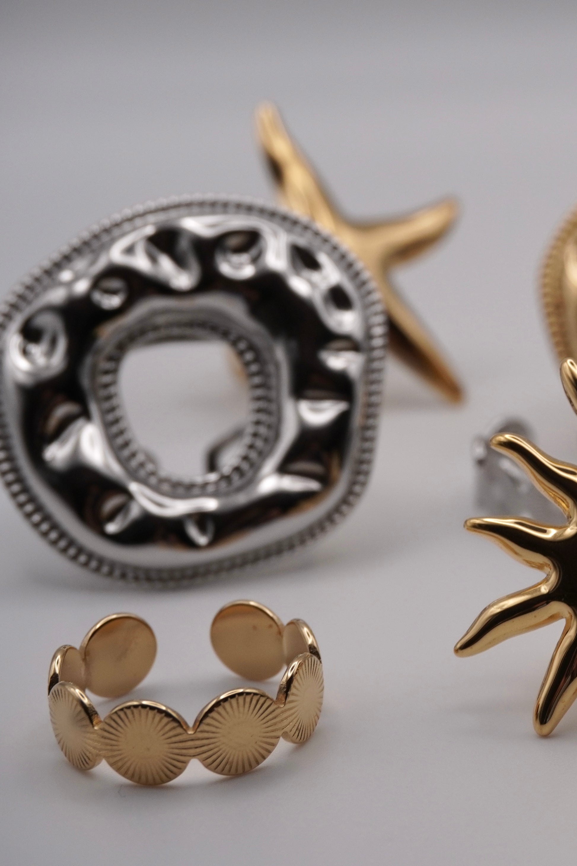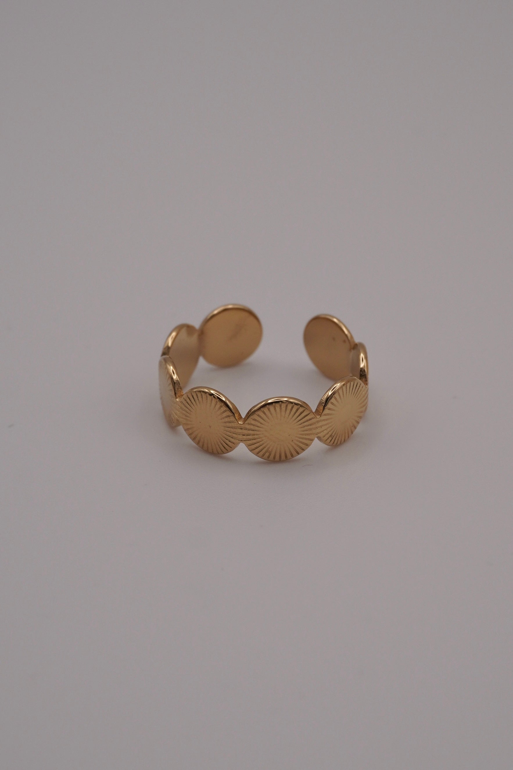 Saida es un anillo minimalista y elegante, con grabados circulares que recuerdan los motivos geométricos del zellige marroquí. Su forma abierta y ligera lo hace fácil de ajustar, ideal para apilar o para lucir solo con delicadeza. Acabado dorado pulido para un brillo sutil pero moderno. Acero inoxidable.