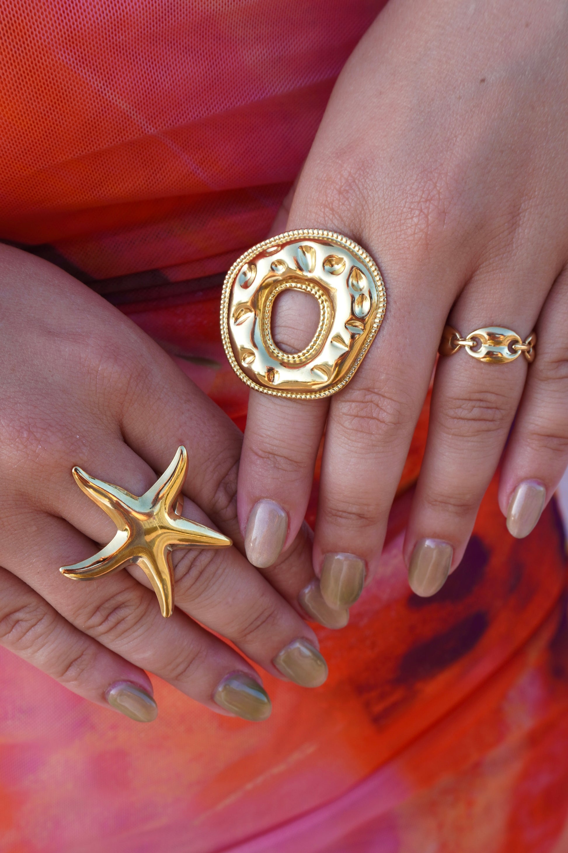 Anillo dorado con diseño de eslabones, minimalista y elegante, ideal para uso diario. Acero inoxidable.