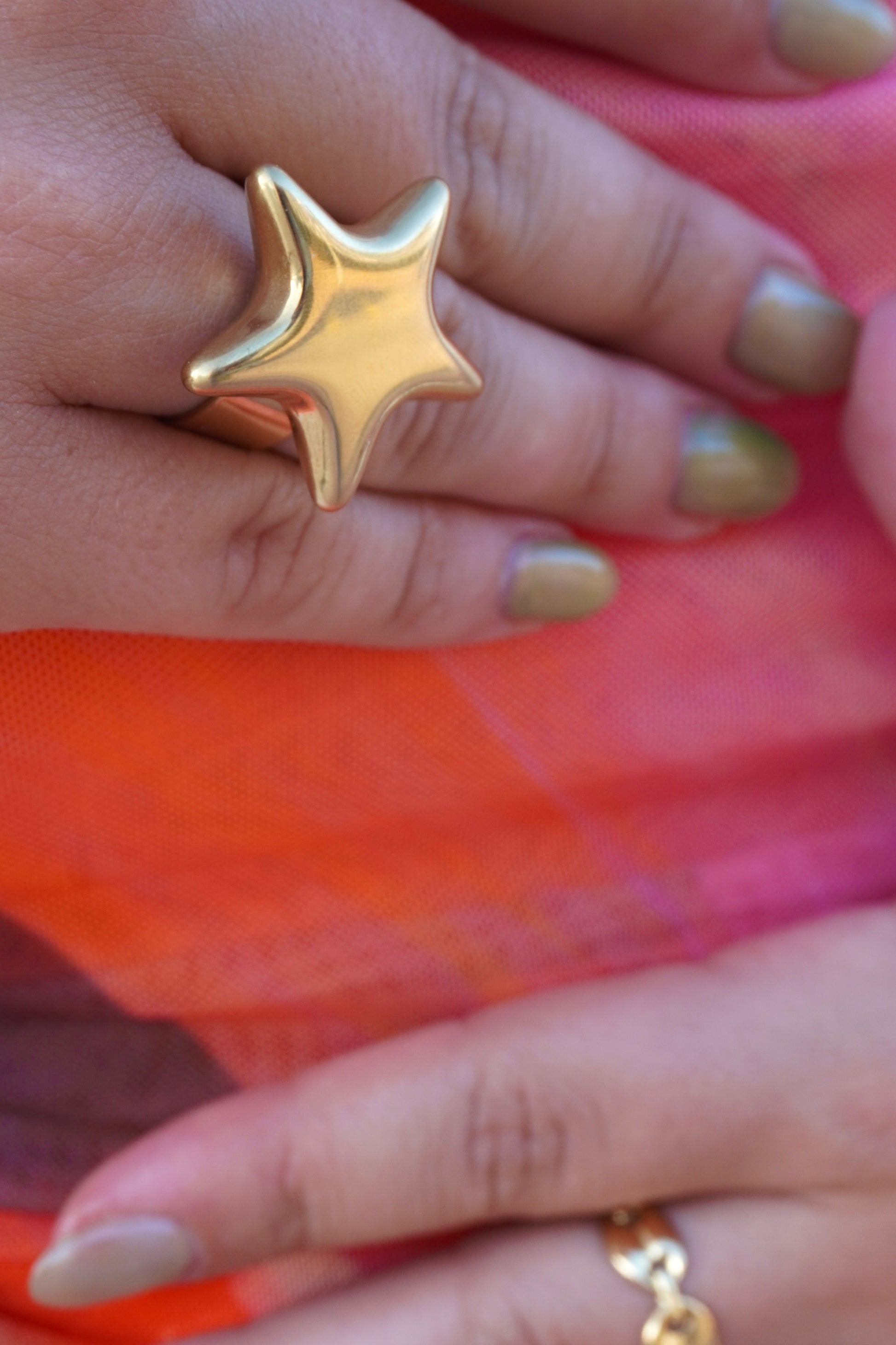 Anillo dorado con diseño de estrella de acabado pulido y estilo moderno y llamativo. Acero inoxidable.