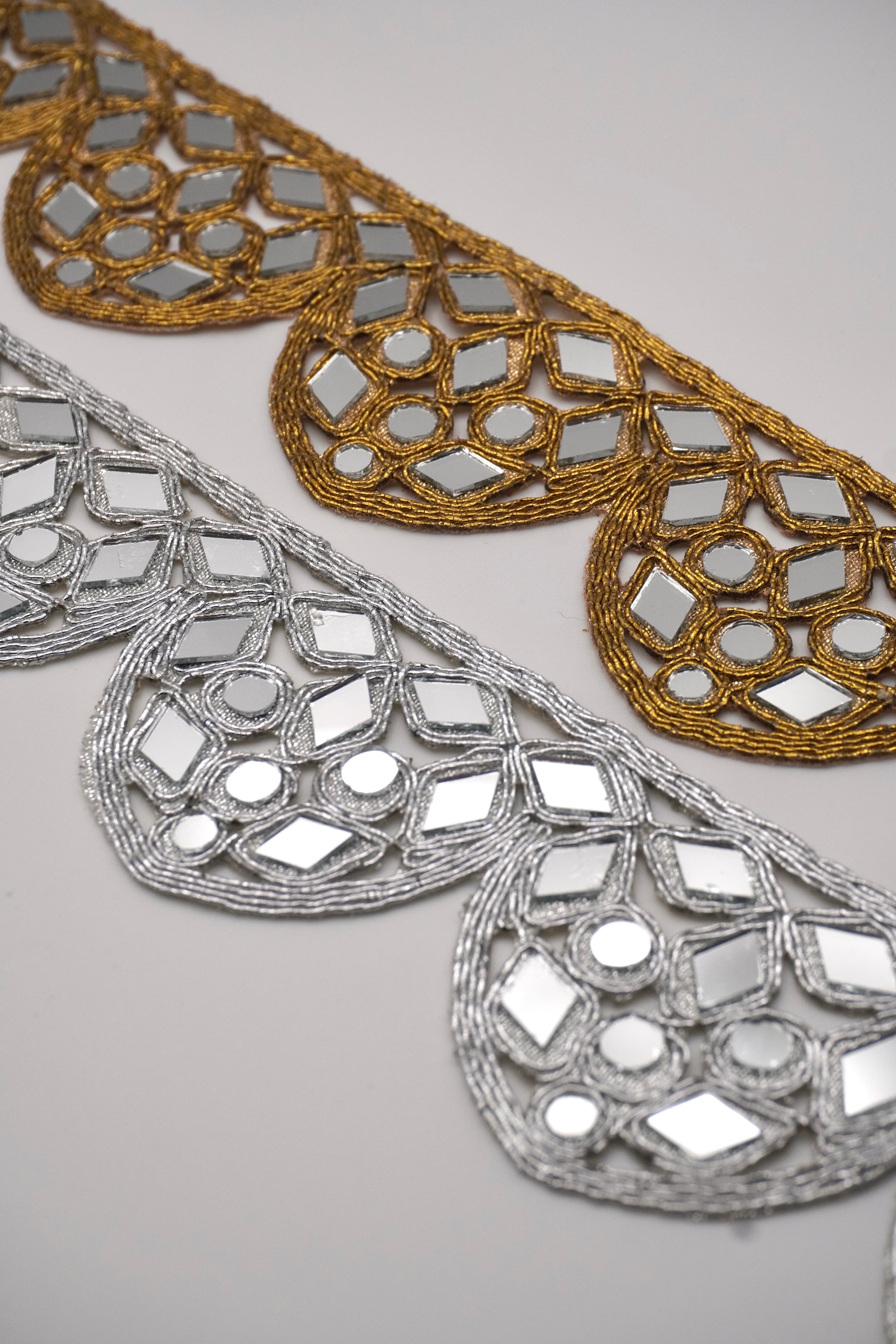Cinturón artesanal con diseño bordado y detalle de espejos incrustados que reflejan la luz para un efecto único y llamativo. Disponible en acabado dorado o plateado, cada pieza combina tradición y modernidad para elevar cualquier look.
