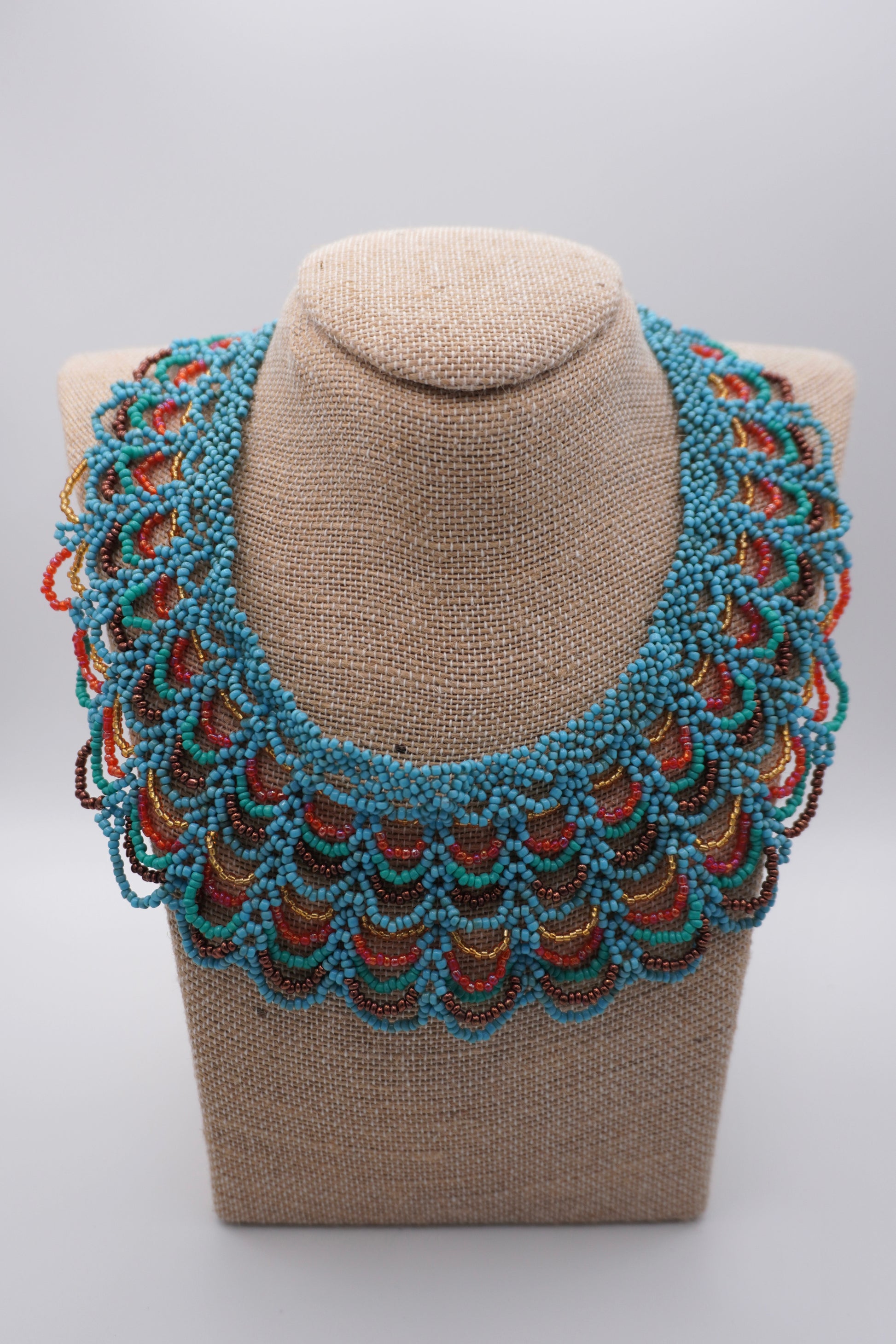 Collar artesanal de cuentas en tonos turquesa, rojo y dorado. Perfecto para dar un toque colorido a tu look.