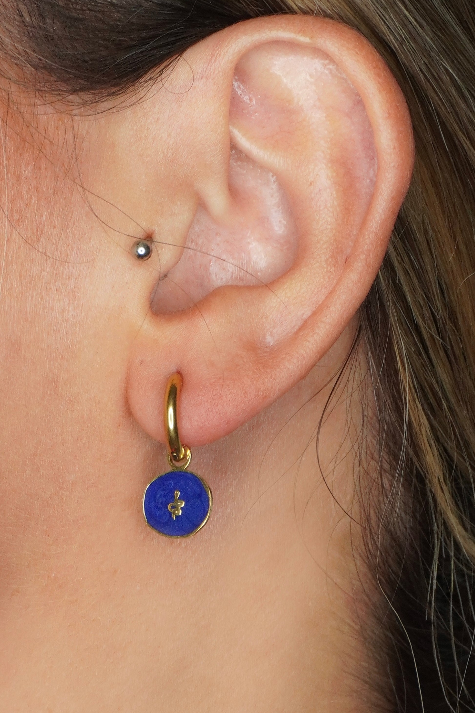 Pendientes de aro en acabado dorado con una medalla redonda esmaltada en azul profundo y detalle central grabado. Un diseño elegante y confortable que añade color y personalidad a cualquier estilo. Perfectos para uso diario o para dar un toque especial a tus looks. Acero inoxidable.